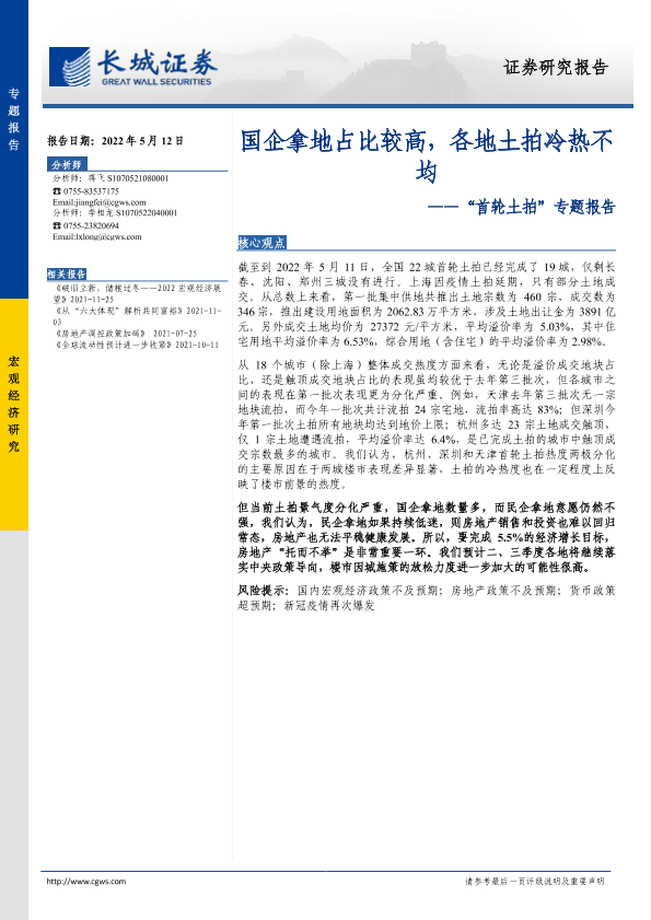 【长城证券】【20220512】“首轮土拍”专题报告:国企拿地占比较高,各地土拍冷热不均-18页