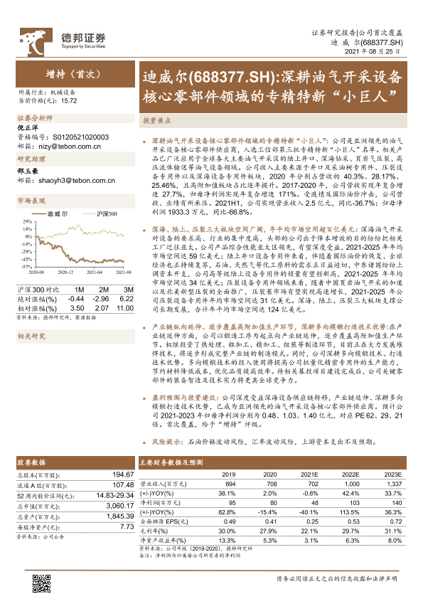 【德邦证券】【20210825】迪威尔(688377.SH) 深耕油气开采设备核心零部件领域的专精特新“小巨人”-39页