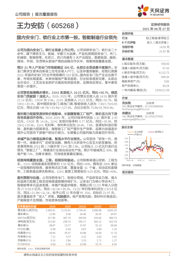 【天风证券】【20210827】国内安全门、锁行业上市第一股,智能制造行业领先-24页