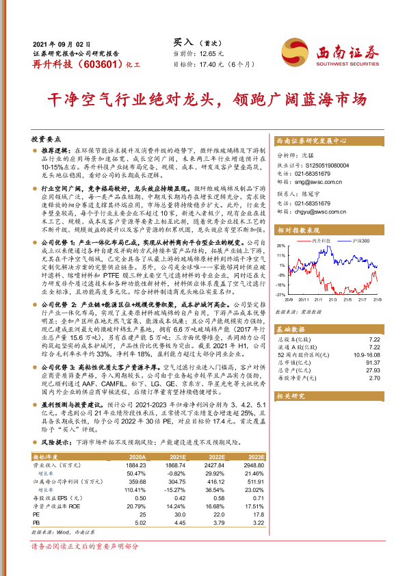 【西南证券】【20210902】20210902-西南证券-再升科技-603601.SH-干净空气行业绝对龙头,领跑广阔蓝海市场-42页