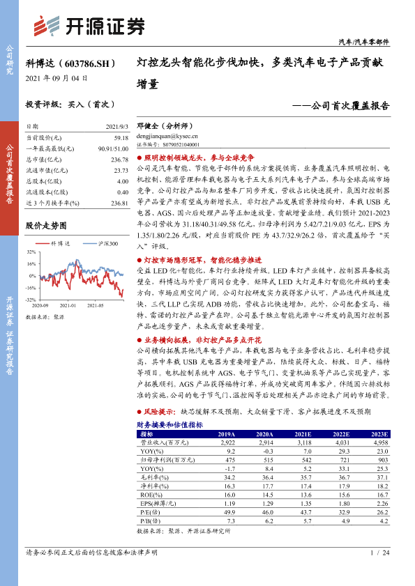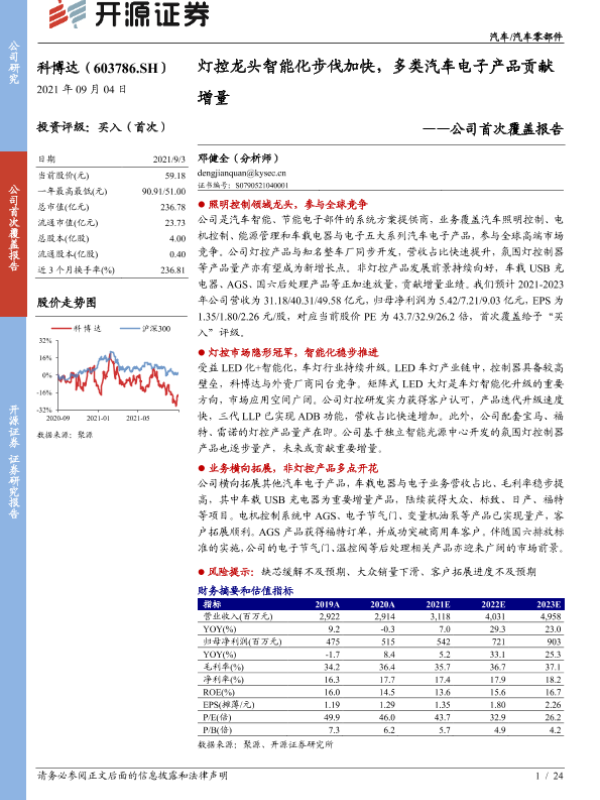 【开源证券】【20210904】科博达-603786.SH-公司首次覆盖报告:灯控龙头智能化步伐加快,多类汽车电子产品贡献增量-24页