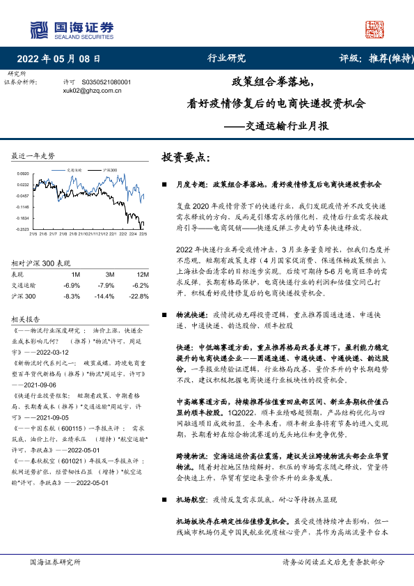 【国海证券】【20220508】交通运输行业月报:政策组合拳落地,看好疫情修复后的电商快递投资机会-31页