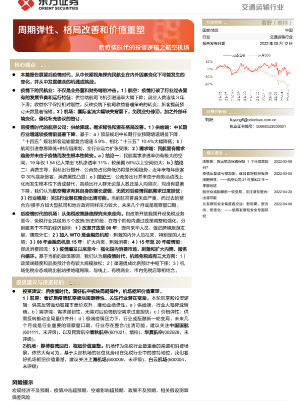 【东方证券】【20220512】交通运输行业:后疫情时代的投资逻辑之航空机场,周期弹性、格局改善和价值重塑-33页