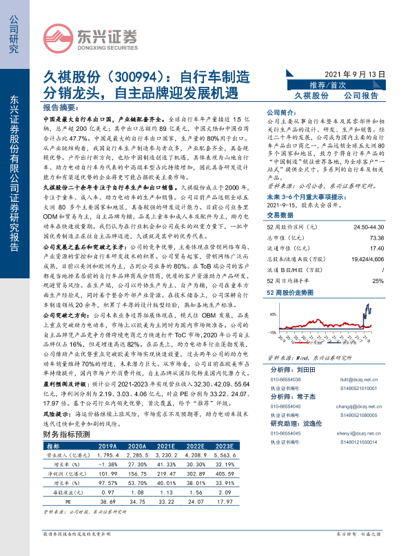 【东兴证券】【20210913】久祺股份:自行车制造分销龙头,自主品牌迎发展机遇-23页