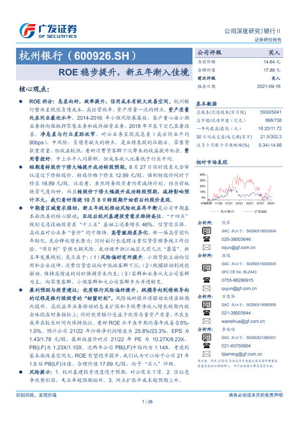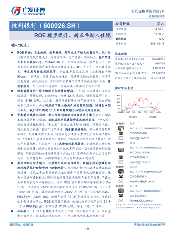 【广发证券】【20210916】杭州银行(600926.SH)ROE稳步提升,新五年渐入佳境-26页