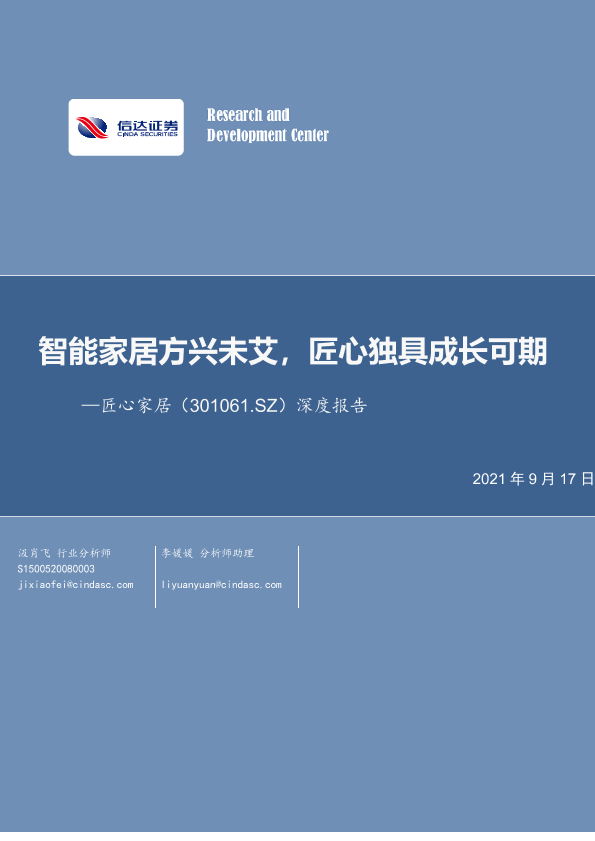 【信达证券】【20210917】20210917-信达证券-匠心家居-301061.SZ-深度报告:智能家居方兴未艾,匠心独具成长可期-24页