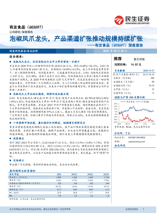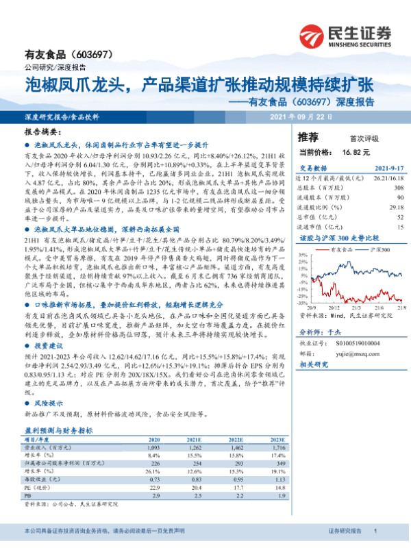 【民生证券】【20210922】有友食品(603697)深度报告:泡椒凤爪龙头,产品渠道扩张推动规模持续扩张-21页