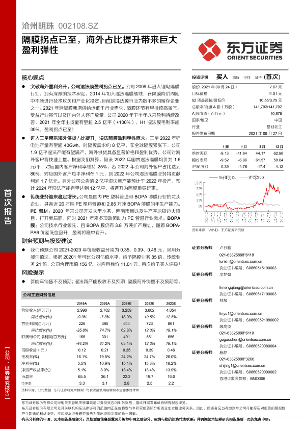 【东方证券】【20210927】隔膜拐点已至,海外占比提升带来巨大盈利弹性-34页