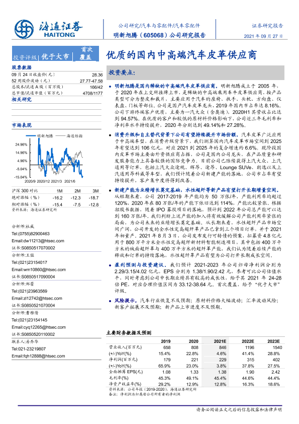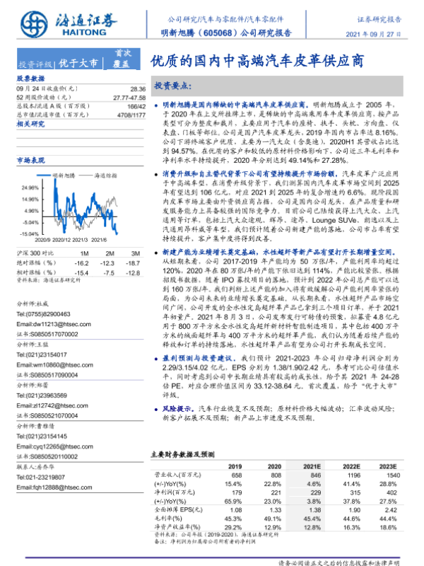 【海通证券】【20210927】20210927-海通证券-明新旭腾-605068.SH-公司研究报告:优质的国内中高端汽车皮革供应商-20页