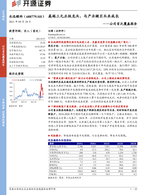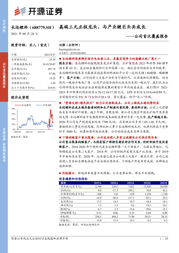 【开源证券】【20210928】20210928-开源证券-长远锂科-688779.SH-公司首次覆盖报告:高端三元正极龙头,与产业链巨头共成长-25页