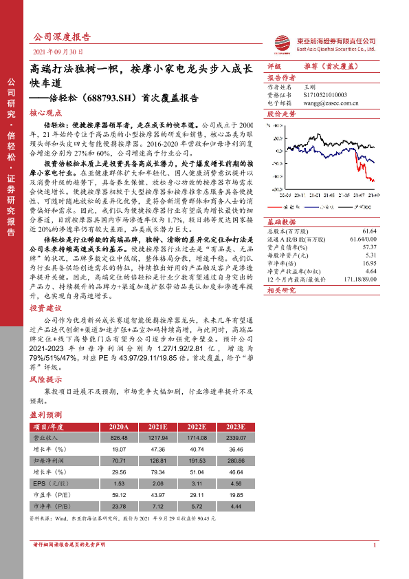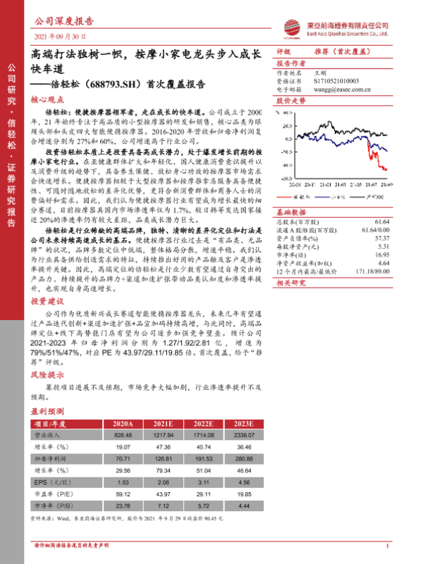 【东亚前海证券】【20210930】20210930-东亚前海证券-倍轻松-688793.SH-首次覆盖报告:高端打法独树一帜,按摩小家电龙头步入成长快车道-32页