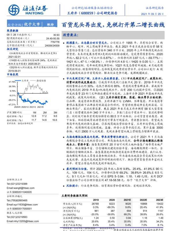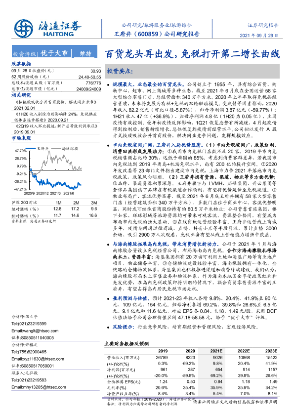 【海通证券】【20210929】20210929-海通证券-王府井-600859.SH-公司研究报告:百货龙头再出发,免税打开第二增长曲线-24页