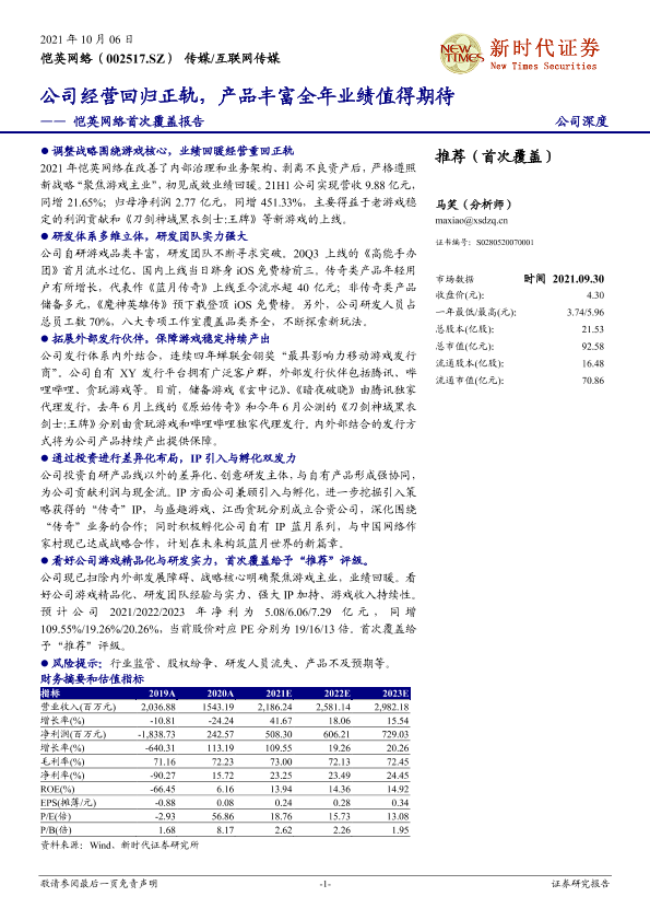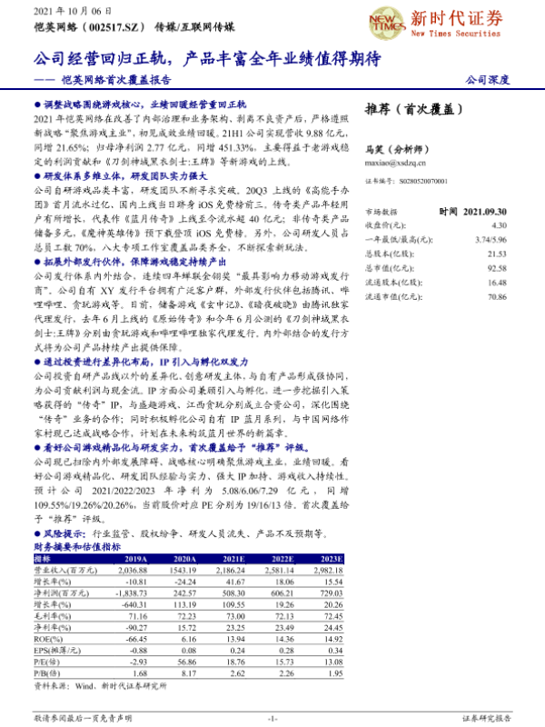 【新时代证券】【20211006】恺英网络首次覆盖报告:公司经营回归正轨,产品丰富全年业绩值得期待-16页