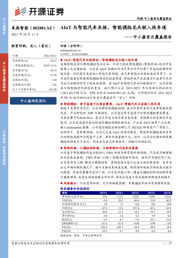 【开源证券】【20211011】20211011-开源证券-美格智能-002881.SZ-中小盘首次覆盖报告:AIoT与智能汽车共振,智能模组龙头驶入快车道-27页