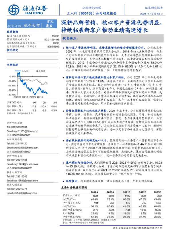 【海通证券】【20211013】三人行-605168.SH-公司研究报告:深耕品牌营销,核心客户资源优势明显,持续拓展新客户推动业绩高速增长-22页