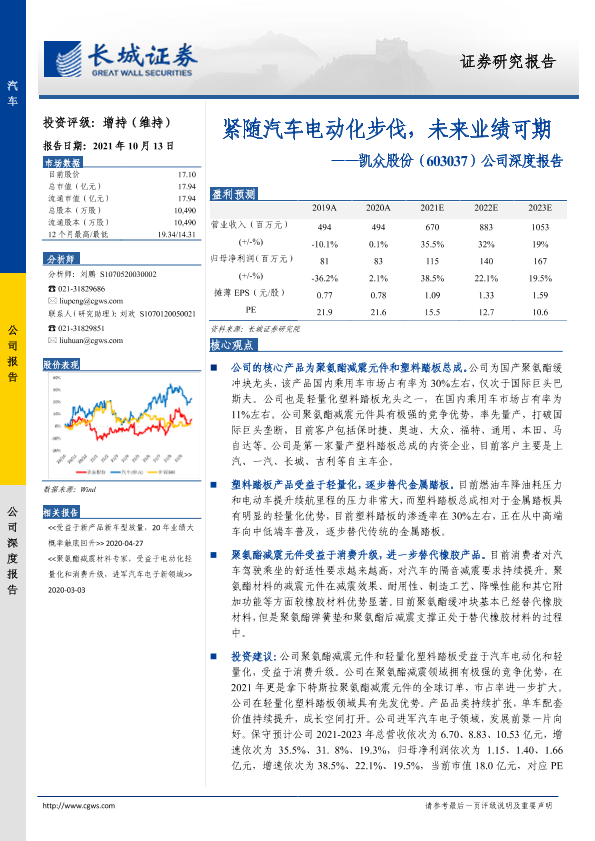 【长城证券】【20211013】20211013-长城证券-凯众股份-603037.SH-公司深度报告:紧随汽车电动化步伐,未来业绩可期-15页