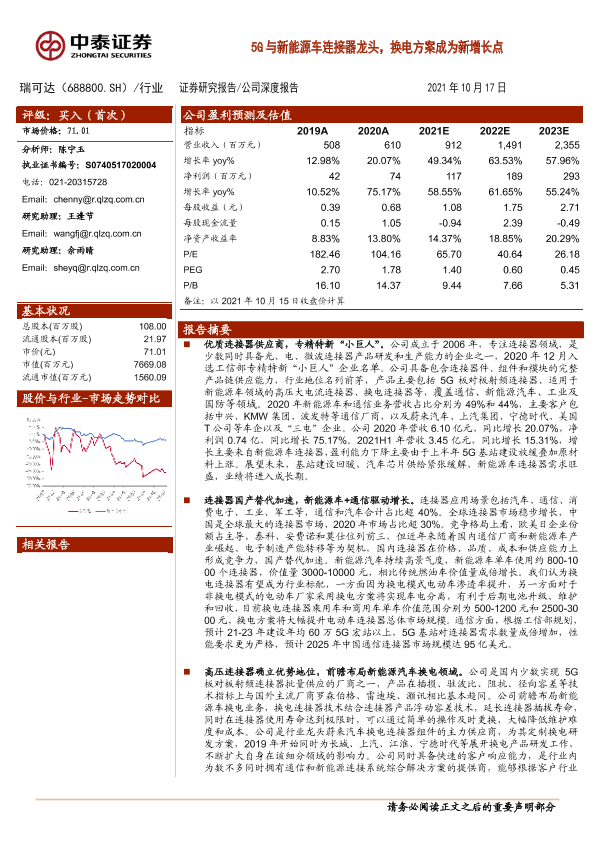 【中泰证券】【20211017】20211017-中泰证券-瑞可达-688800.SH-5G与新能源车连接器龙头,换电方案成为新增长点-40页