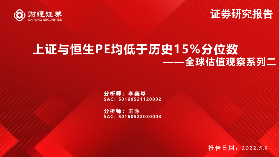 【财通证券】【20220509】全球估值观察系列二:上证与恒生PE均低于历史15%分位数-25页