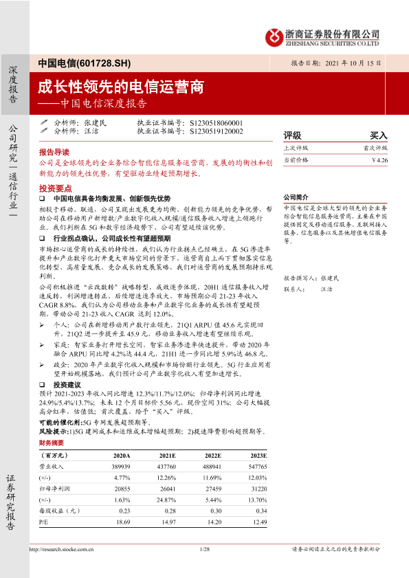 【浙商证券】【20211015】中国电信深度报告:成长性领先的电信运营商-28页
