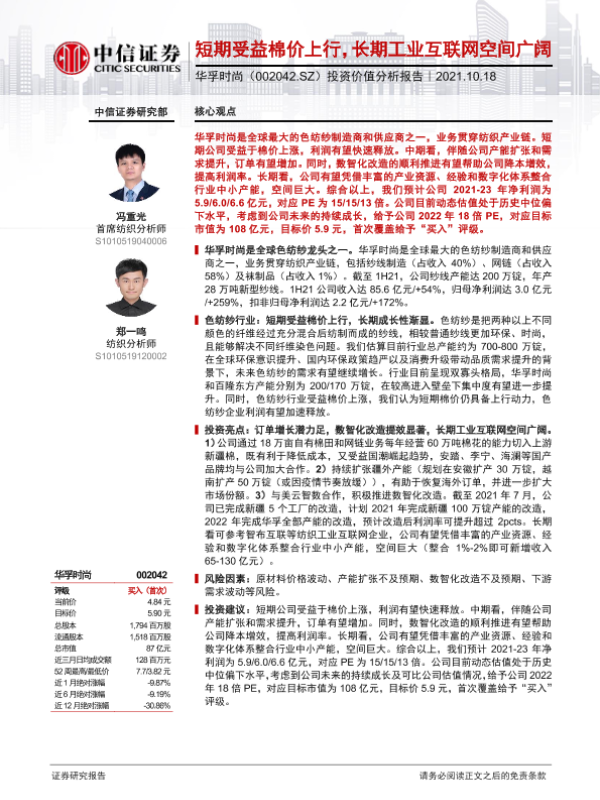 【中信证券】【20211018】20211018-中信证券-华孚时尚-002042.SZ-投资价值分析报告:短期受益棉价上行,长期工业互联网空间广阔-25页
