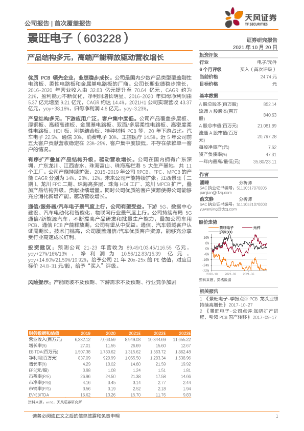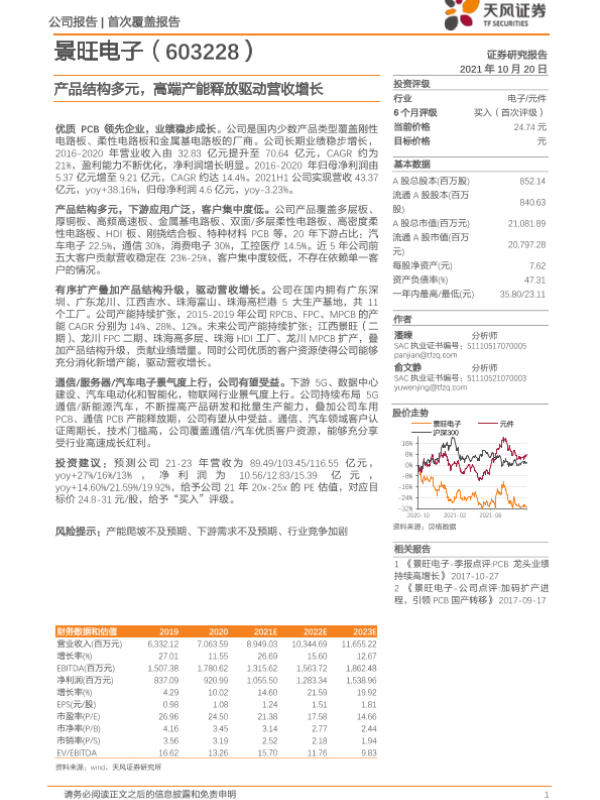 【天风证券】【20211020】20211020-天风证券-景旺电子-603228.SH-首次覆盖报告:产品结构多元,高端产能释放驱动营收增长-30页