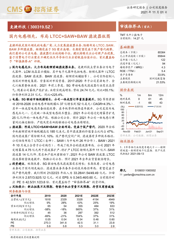 【海通证券】【20211101】麦捷科技-国内电感领先,布局LTCC+SAW+BAW滤波器版图-23页