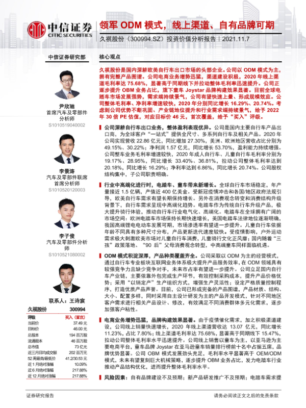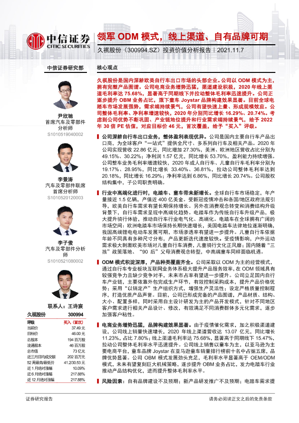【中信证券】【20211107】20211107-中信证券-久祺股份-300994.SZ-投资价值分析报告:领军ODM模式,线上渠道、自有品牌可期-31页