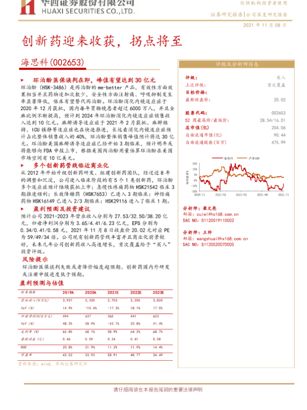 【华西证券】【20211108】20211108-华西证券-海思科-002653.SZ-创新药迎来收获,拐点将至-22页