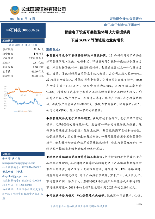 【长城国瑞证券】【20211111】智能电子设备可靠性整体解决方案提供商 下游5G EV等领域驱动业务增长-26页