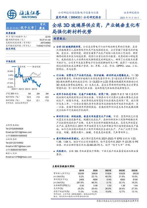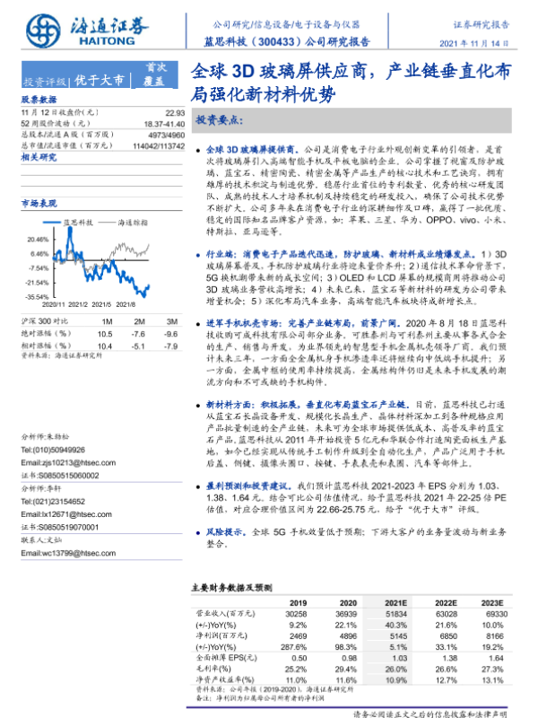 【海通证券】【20211114】蓝思科技-300433.SZ-公司研究报告:全球3D玻璃屏提供商,产业链垂直化布局强化新材料优势-24页