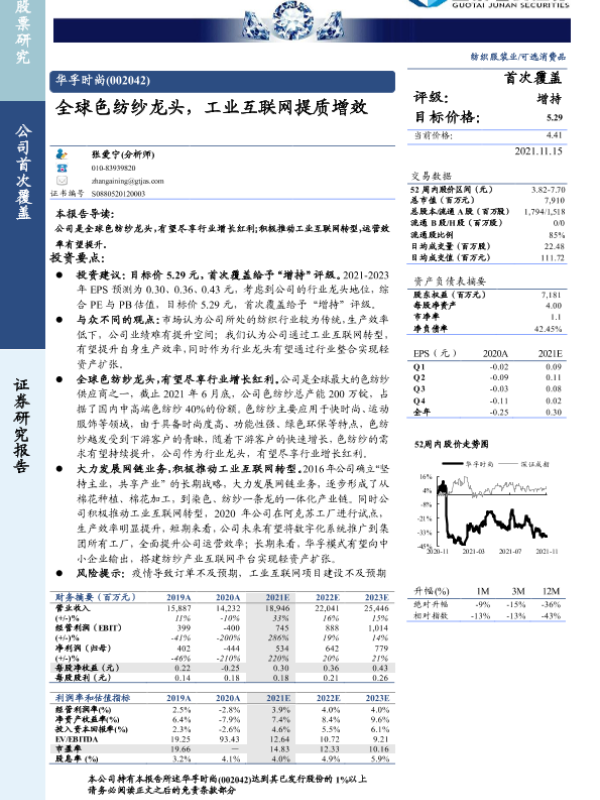 【国泰君安证券】【20211115】华孚时尚(002042):全球色纺纱龙头,工业互联网提质增效-20页