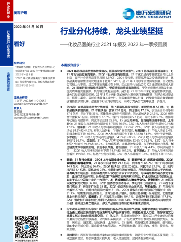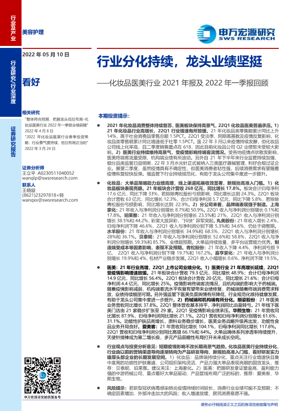 【申万宏源】【20220510】化妆品医美行业2021年报及2022年一季报回顾:行业分化持续,龙头业绩坚挺-20页
