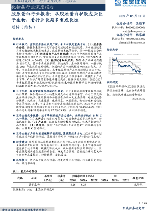 【东吴证券】【20220512】化妆品行业深度报告:胶原蛋白行业报告,从胶原蛋白护肤龙头巨子生物,看行业长期多重成长性-26页