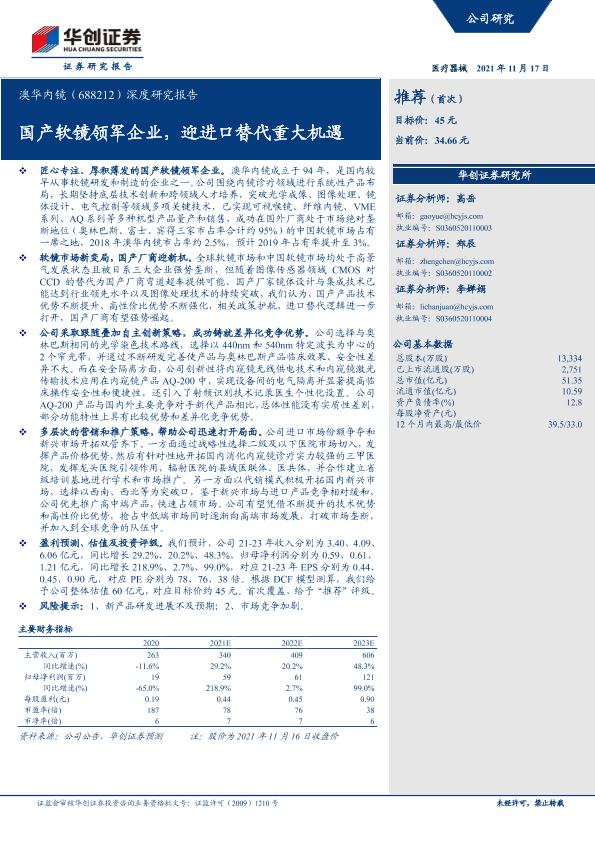 【华创证券】【20211117】20211117-华创证券-澳华内镜-688212.SH-深度研究报告:国产软镜领军企业,迎进口替代重大机遇-29页
