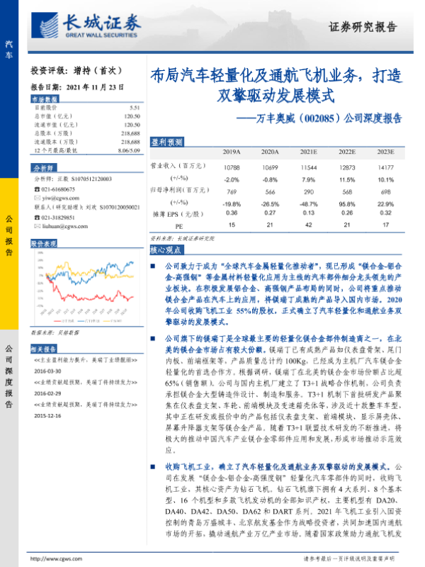 【长城证券】【20211123】20211123-长城证券-万丰奥威-002085.SZ-公司深度报告:布局汽车轻量化及通航飞机业务,打造双擎驱动发展模式-22页