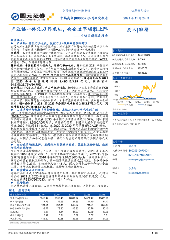 【国元证券】【20211124】中钨高新深度报告:产业链一体化刀具龙头,央企改革轻装上阵-33页