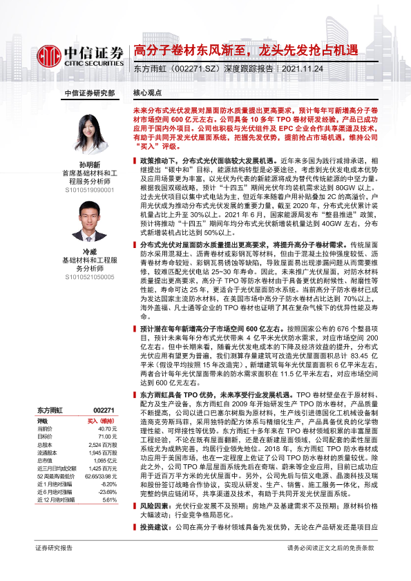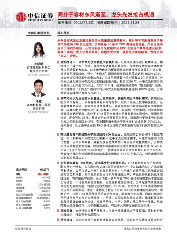 【中信证券】【20211124】20211124-中信证券-东方雨虹-002271.SZ-深度跟踪报告:高分子卷材东风渐至,龙头先发抢占机遇-36页