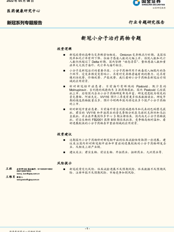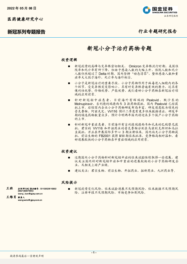 【国金证券】【20220508】医药健康行业新冠系列专题报告:新冠小分子治疗药物专题-29页
