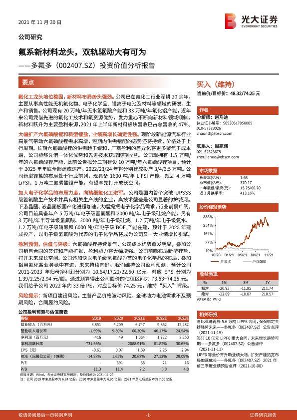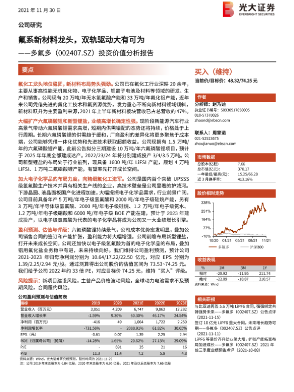 【光大证券】【20211130】多氟多(002407.SZ)投资价值分析报告:氟系新材料龙头,双轨驱动大有可为-41页