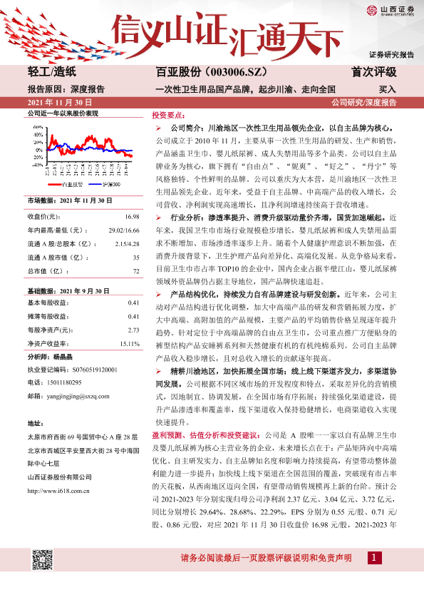 【山西证券】【20211130】20211130-山西证券-百亚股份-003006.SZ-一次性卫生用品国产品牌,起步川渝、走向全国-40页