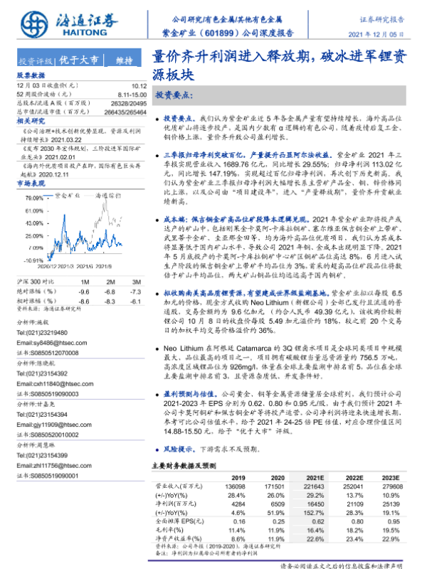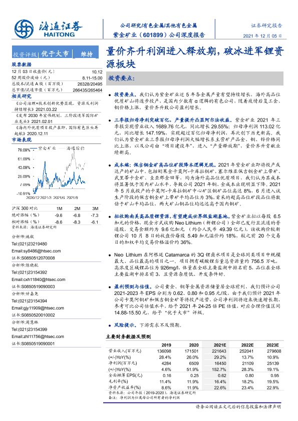 【海通证券】【20211205】20211205-海通证券-紫金矿业-601899.SH-公司深度报告:量价齐升利润进入释放期,破冰进军锂资源板块-20页