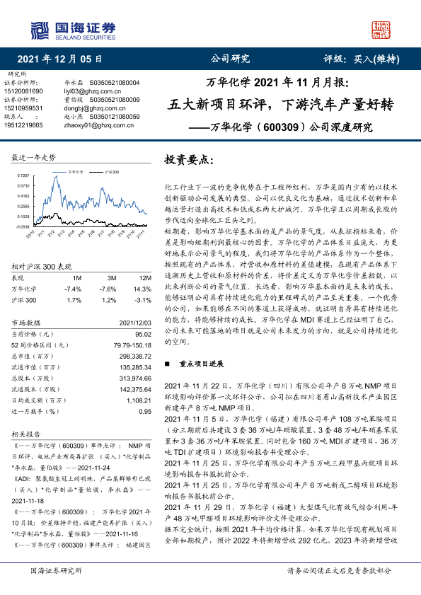 【国海证券】【20211205】万华化学2021年11月月报:五大新项目环评,下游汽车产量好转-30页