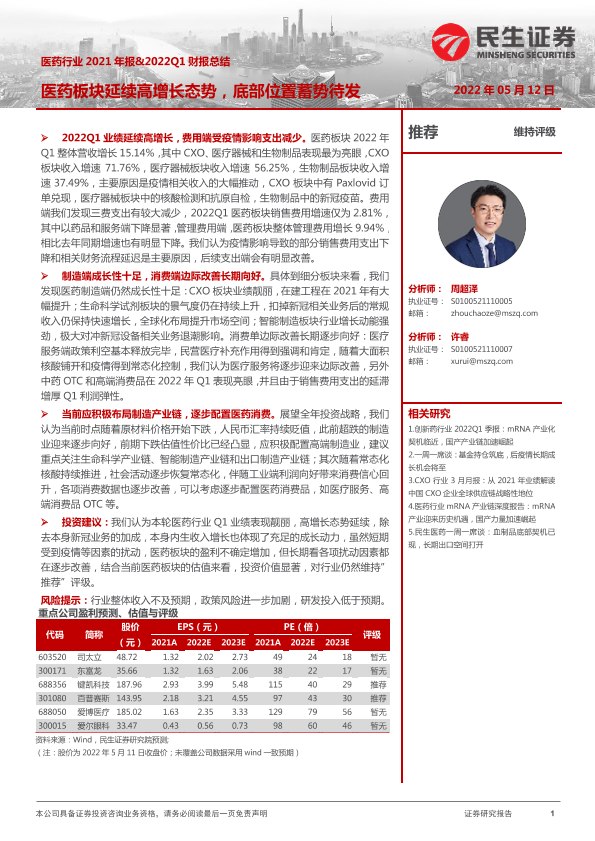 【民生证券】【20220512】医药行业2021年报&2022Q1财报总结:医药板块延续高增长态势,底部位置蓄势待发-55页