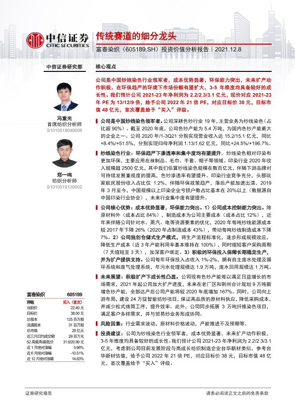 【中信证券】【20211208】20211208-中信证券-富春染织-605189.SH-投资价值分析报告:传统赛道的细分龙头-27页