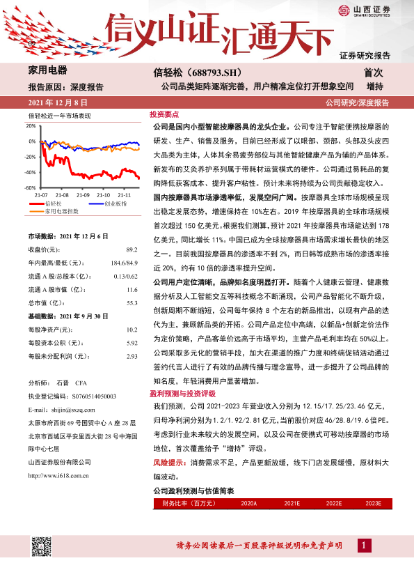 市场分析 按摩器具 智能健康 盈利预测 股票评级