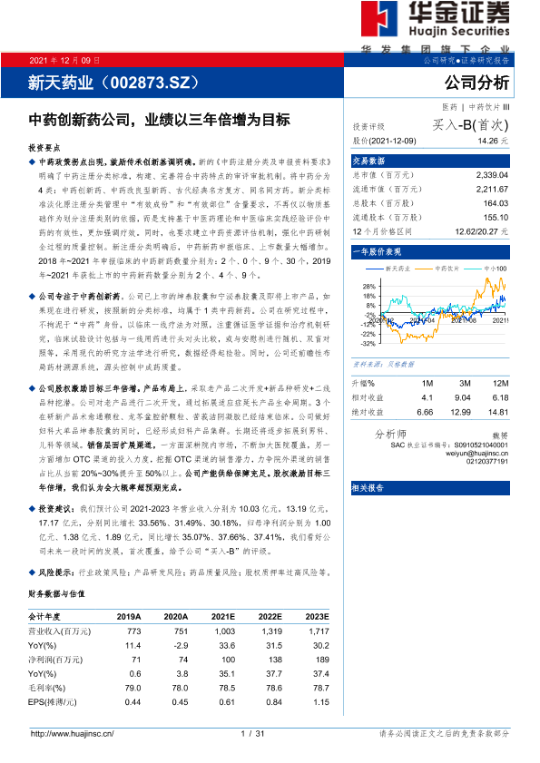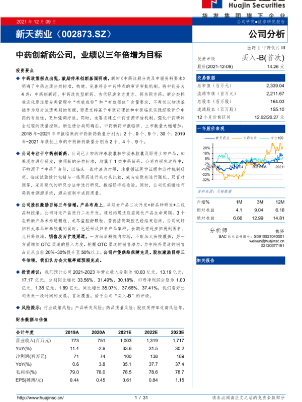 【华金证券】【20211209】新天药业(002873.SZ)公司分析:中药创新药公司,业绩以三年倍增为目标-31页