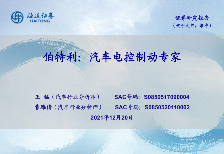 【海通证券】【20211220】伯特利:汽车电控制动专家-34页