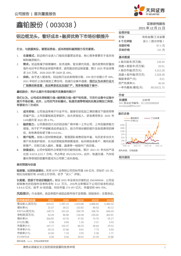 【天风证券】【20211221】鑫铂股份-铝边框龙头,看好成本+融资优势下市场份额提升-22页
