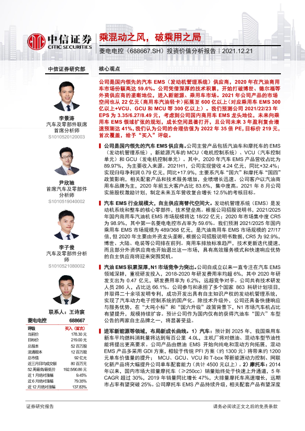 乘用车市场 技术突破 新能源 汽车EMS 菱电电控