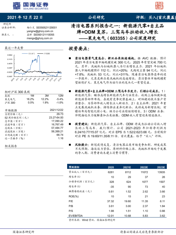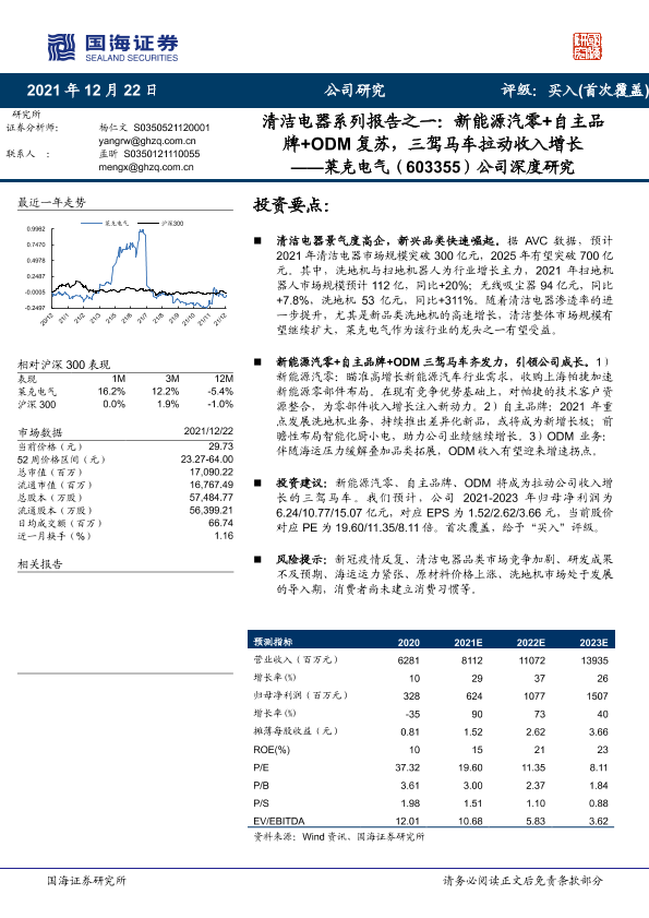 【国海证券】【20211222】清洁电器系列报告之一:新能源汽零+自主品牌+ODM复苏,三驾马车拉动收入增长——莱克电气(603355)公司深度研究-37页